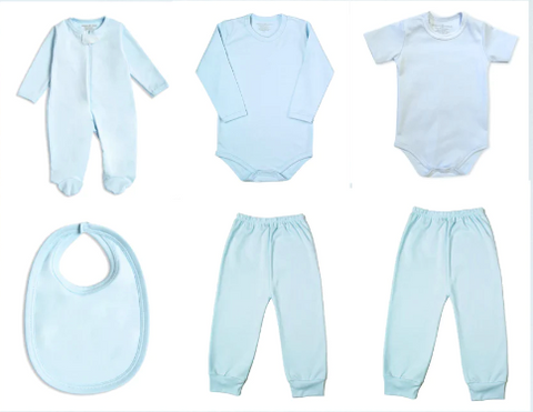 Sizes: 3-6:, 6-9, 9-12, 12-18, 18-24: Zippered sleep n play, 2 classic pants, long sleeve onesie, short sleeve onesie, a bib.