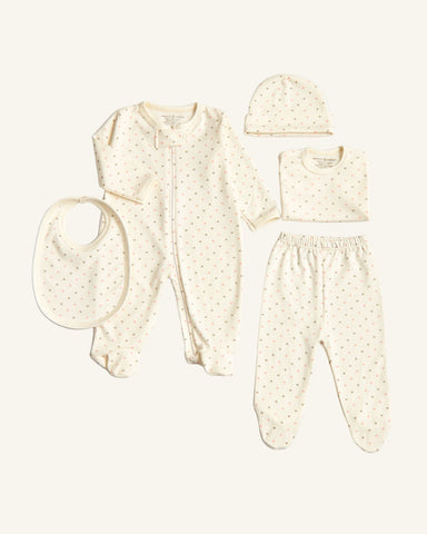This set includes all the essentials for baby’s first days — from cozy footies to a matching hat, bib, and top-and-bottom outfit. Ideal for hospital bags, newborn photos, or as a heartfelt baby shower gift.
