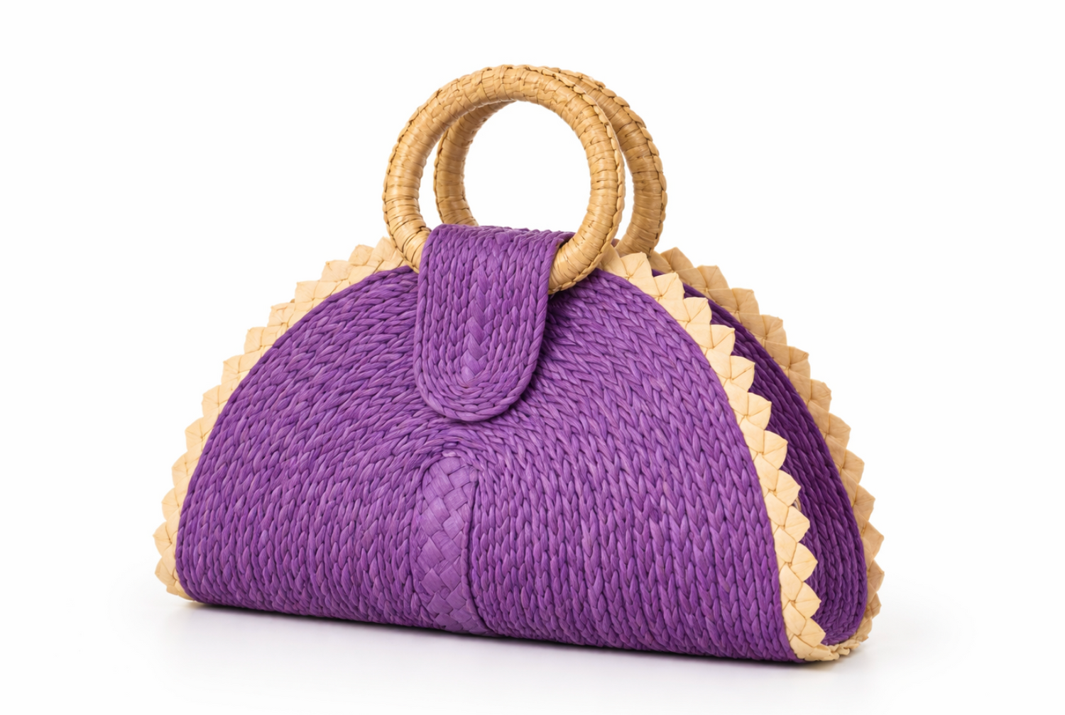 Our Lavender Plum Palm Purse is hand-woven from natural palm leaves by skilled artisans, giving each bag its own subtle variations and character. The structured half-moon silhouette, delicate scalloped edging, and circular straw handle create a timeless look that feels both elegant and playful — perfect for little girls who love to dress up.