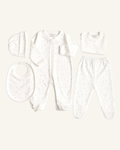 Size 0-3 and 3-6 months: Zippered baby sleep n play footie, classic pants, long sleeve onesie, short sleeve onesie, newborn hat, and a bib.